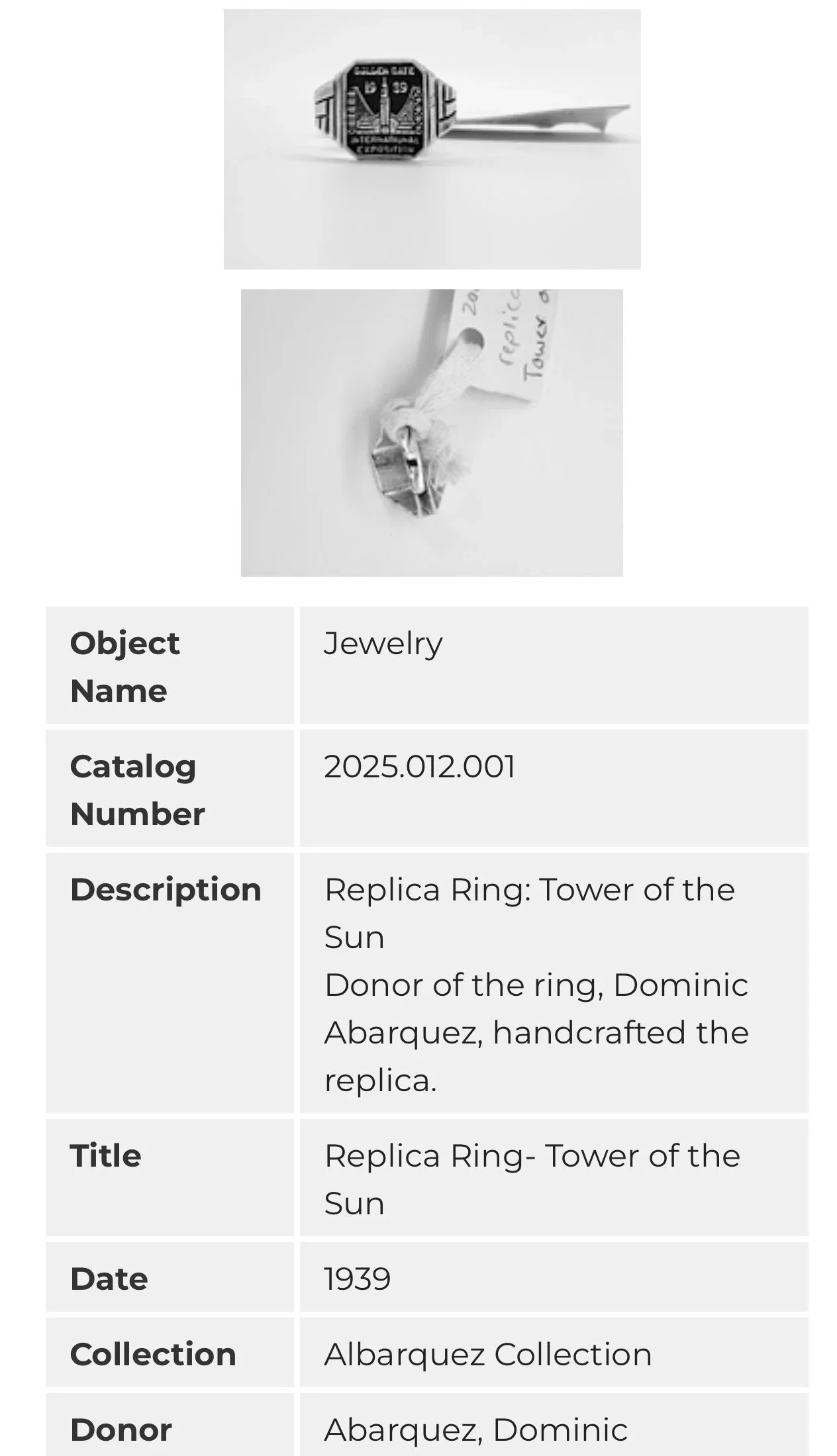 treasure island museum 1939 golden gate international exposition (GGIE) replica ring